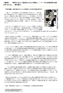 さて、本全体の論の展開としては、啓示論に関する著者のバックボーンであるマルティン・ハイデガーが説いた「『存在』を立ち顕す『存在者』」という哲学的思考が用いられていることが鮮明になっています。見えざる神を顕す存在者としてのイエス・キリストを特殊啓示として最前面に打ち立てています。「イエス・キリストという人間の歴史の中に生まれ生きられた存在者を通して、神が『わたし』にとってどのような関わり合いがあるのかということをより具体的に知ることができる…神学の言葉で言うとき、それは特殊啓示という言葉になります。」(33-34頁)この啓示論の視点から、イエスの救済論的役割に関しても踏み込んでいるところが痛快です。神との正しい「関係」に戻ることを「救い/掬い」とするがゆえに著者は、主の祈りにおいて信者に至高神を「天の父なる神」と呼ばせるイエス・キリストの啓示論的・救済論的役割をこのように記します。「そのことによって、神を父とするイエス・キリストの宗教経験をなぞらわせます。それは、わたしたちに、神を父として追体験させ、それに応答するという信仰を求めているからです。」(52頁)