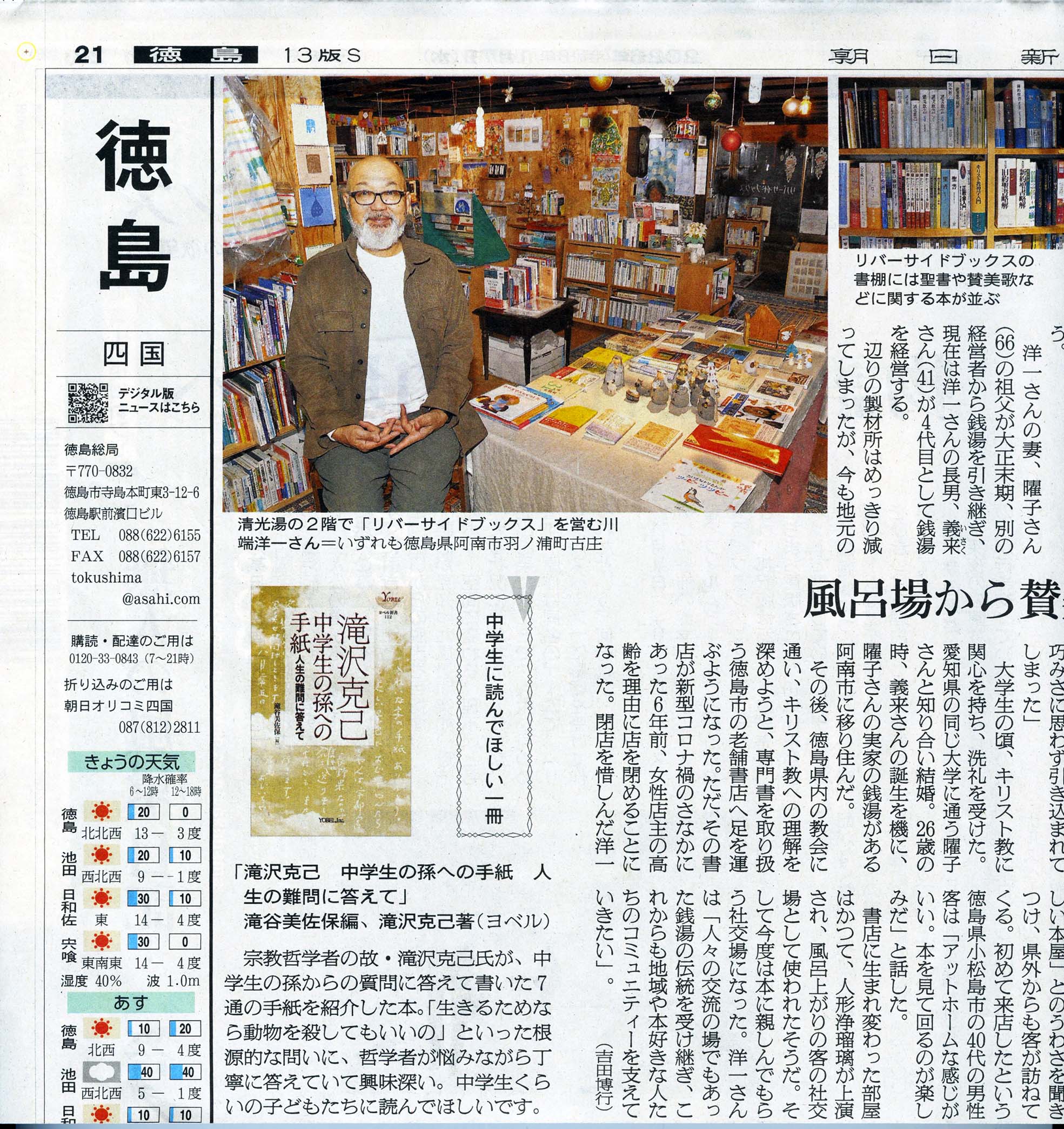 朝日新聞・徳島版に、書店の紹介と共に、小社の滝谷美佐保[編]滝沢克己 中学生の孫への手紙  人生の難問に答えてが店主・川端さんの紹介で掲載されました。